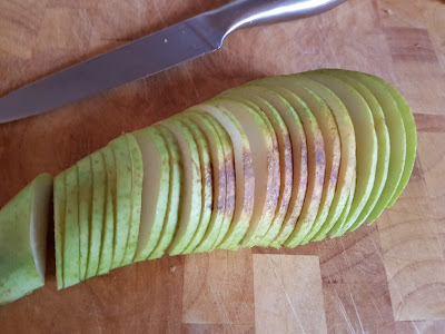 2 Birnen in dünne Scheiben schneiden. Diese müssen sich biegen lassen ohne zu brechen.